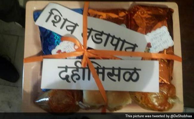 It was her tweets on Wednesday that have enraged the Sena, a party that is easily offended and known to resort to often-violent demonstrations. "No more pop corn at multiplexes in Mumbai? Dahi misal and vada pav only. To go better with the Marathi movies at prime time," Ms De had said. "An attack on Marathi culture is an insult to us. We will give her a taste of Vada Pav," said the Sena's Sanjay Raut. Ms De tweeted a picture of the box of eats left for her today by the Sena pictures, and said, "They seem delicious. I look forward to eating them."