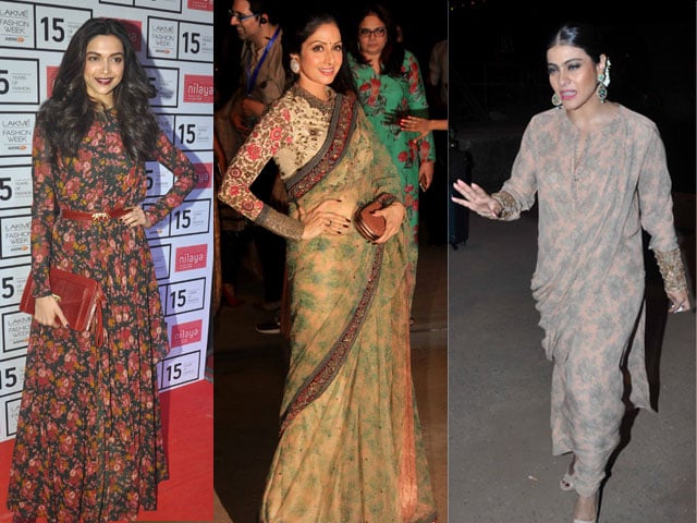 A small army of actresses dressed by Sabyasachi made for very glamorous off-ramp viewing. Chief among the famous faces was Happy New Year star Deepika Padukone who looked exactly right in a floral maxidress. Sridevi and Kajol picked ethnic looks from his collection - Sridevi in a diaphanous sari and an elaborate blouse, Kajol in the pales of pinks strewn with mint flowers.