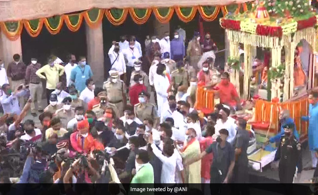 After the ritual, three chariots began a symbolic rath yatra without the usual festivities inside the premises of the Lord Jagannath temple in Jamalpur area of Ahmedabad.