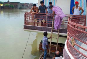 A woman using a ladder to get down to a boat from a house in a flooded locality in Allahabad.