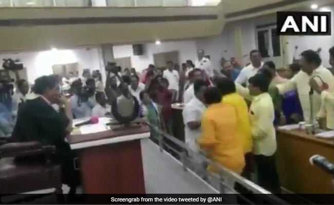 A fight broke out at a meeting at the Vijayawada Municipal Corporation on Saturday after portraits of TDP leaders NT Rama Rao and N Chandrababu Naidu were replaced with pictures of YSR Congress chief and Andhra Pradesh Chief Minister YS Jagan Mohan Reddy at the council hall.