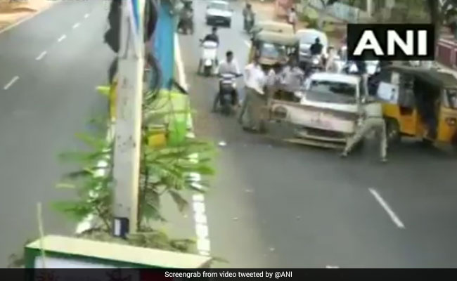 #WATCH: Youth stopped for checking by policemen at a checkpoint in Kakinada, tried to escape after running over them, allegedly in an inebriated condition. Accused arrested. Two policemen injured #AndhraPradesh (25.03.18) pic.twitter.com/AnrB75lZsP