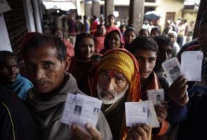 People hold voter id cards as they wait in line to cast vote