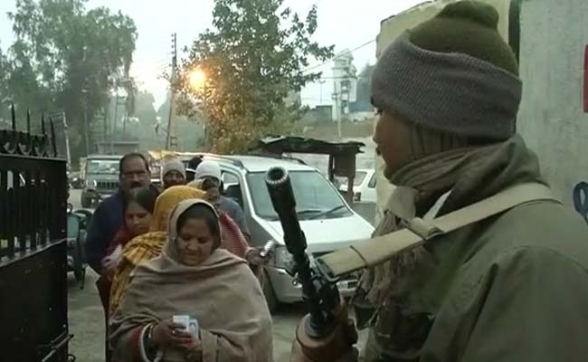 Voters wait in line outside a polling booth in Kathua.