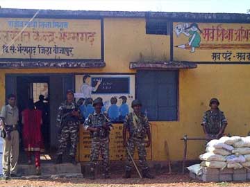 Security personnel keep watch at a polling station in Bhairamgarh, Bijapur district in the Bastar region of Chhattisgarh.