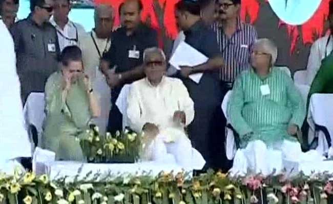 File photo of Sonia Gandhi, Nitish Kumar and Lalu Yadav at the announcement of grand alliance for Bihar polls