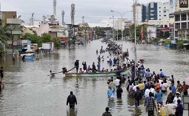People travel on a boat as they move to safer places through a flooded road in Chennai. (Reuters Photo)