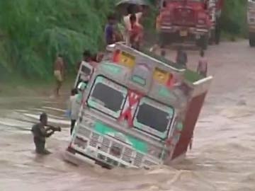 Dramatic images show some people hanging on to the truck stranded in the swirling waters of the river.