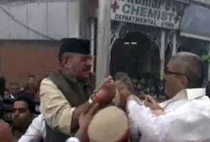 On camera, the two men - one in a Gandhi cap and Nehru jacket, the other in politico white with dark glasses - are seen refusing to let go of the pole and snarling at each other as they make attempts to grab the rope that would release the flag. People around try to pull them away and many voices are heard requesting them to do it together.