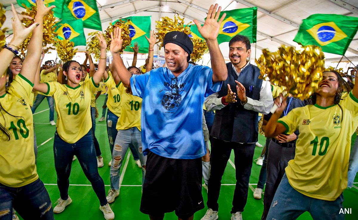 Ronaldinho's next stop was the Sreebhumi Sporting Club puja pandal in Kolkata's Lake Town. He was in for a pleasant surprise when he was welcomed with a tilak on the forehead. He inaugurated the pandal and also joined in a dance with his fans who waved Brazil flags. That was not all. The football legend was invited to take a shot at a football net guarded by Bengal minister Bose, chief organiser of the Sreebhumi sporting Club puja and a sports enthusiast. Ronaldinho scored.