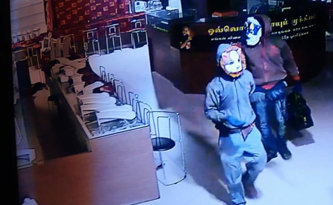 Two men wearing tiger and bull masks robbed jewels worth several crores from a popular jewellery showroom in Tamil Nadu's Tiruchirappalli.
