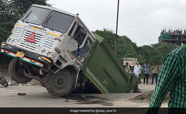 A road near Ahmedabad's Juhapura area caved in on Wednesday afternoon and led to Ahmedabad Municipal Corporation's (AMC) garbage truck falling into the crack.