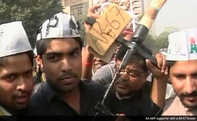 One supporter has fashioned a broom, the Aam Aadmi Party's election symbol into a gun and has called it AK- 67. That combines with Mr Kejriwal's initials and the number of seats his party has won in the 70-member Delhi Assembly, in a massive win that saw the two-year-old party crush the BJP and wipe out the Congress in the Delhi elections this week.