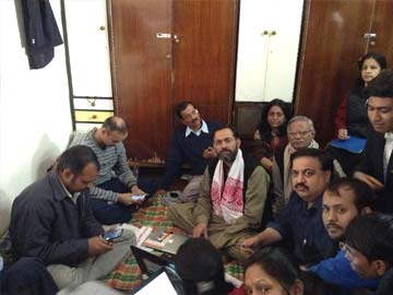 Aam Aadmi Party leaders monitor results at their headquarters in Delhi
