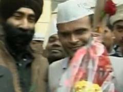 Among them a man who had brought along a bouquet fashioned out of a broom, the election symbol of Mr Kejriwal's Aam Aadmi Party, to present to him.