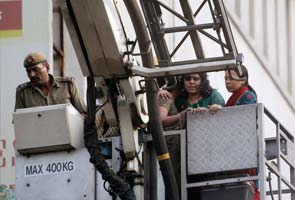 Two hydraulic elevators were pressed into service by fire brigade officials who broke the window panes and rescued them from the top floor of the building.