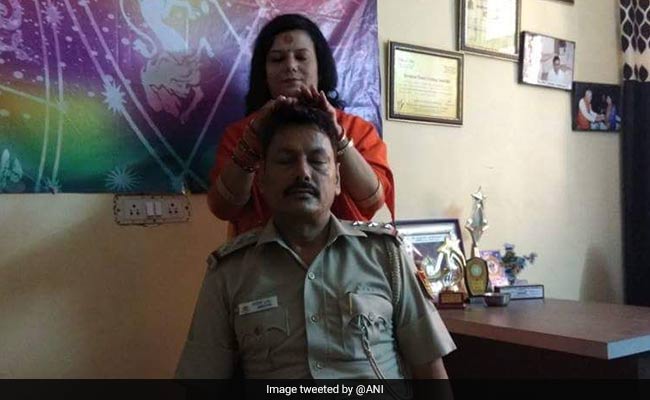 In the photo, the officer is in his uniform, his eyes shut as the saffron-robed Namita Acharya, who calls herself a sadhvi, is seen standing behind him in a gesture of blessing. The photo appears to have been taken in his office.