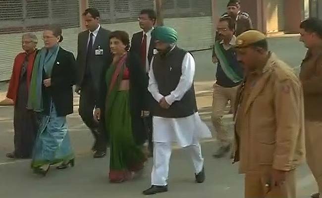 Congress President Sonia Gandhi, former Delhi Chief Minister Sheila Dikshit and party candidate Kiran Walia at the Nirman Bhawan polling booth in Delhi.