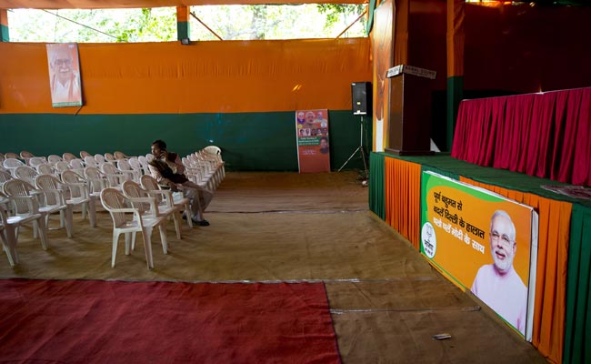 A BJP member sits near an empty stage set up for addressing the media at a deserted headquarters of the party in Delhi. (Associated Press Photo)
