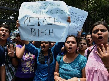 Delhi University's B.Tech students protest against the rollback of the controversial Four Year Undergraduate Programme (FYUP) at Shastri Bhawan in New Delhi on Saturday