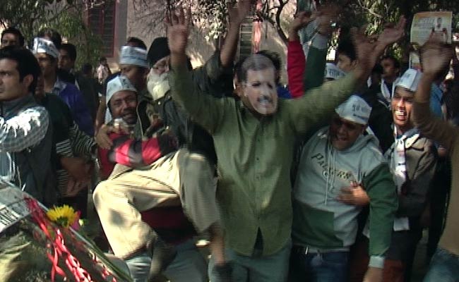 AAP volunteers celebrate after winning 67 of Delhi's 70 seats on Tuesday