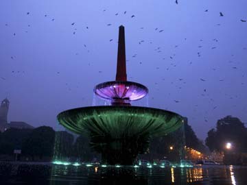 Vijay Chowk illuminated on a foggy evening in Delhi