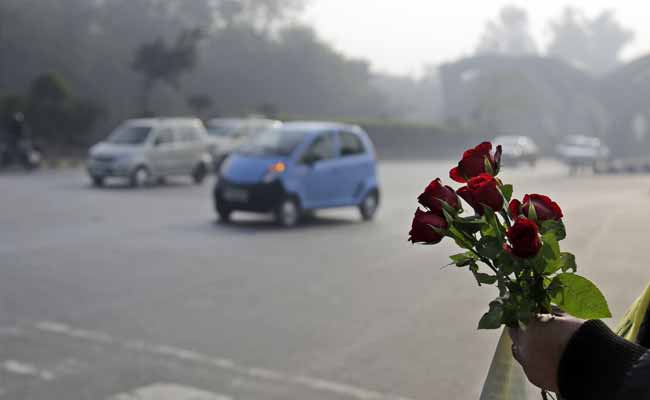 A civilian volunteer holds roses to be given to the drivers not following the rules on the first day of a two-week experiment to reduce the number of cars to fight pollution in New Delhi. (AP Photo)