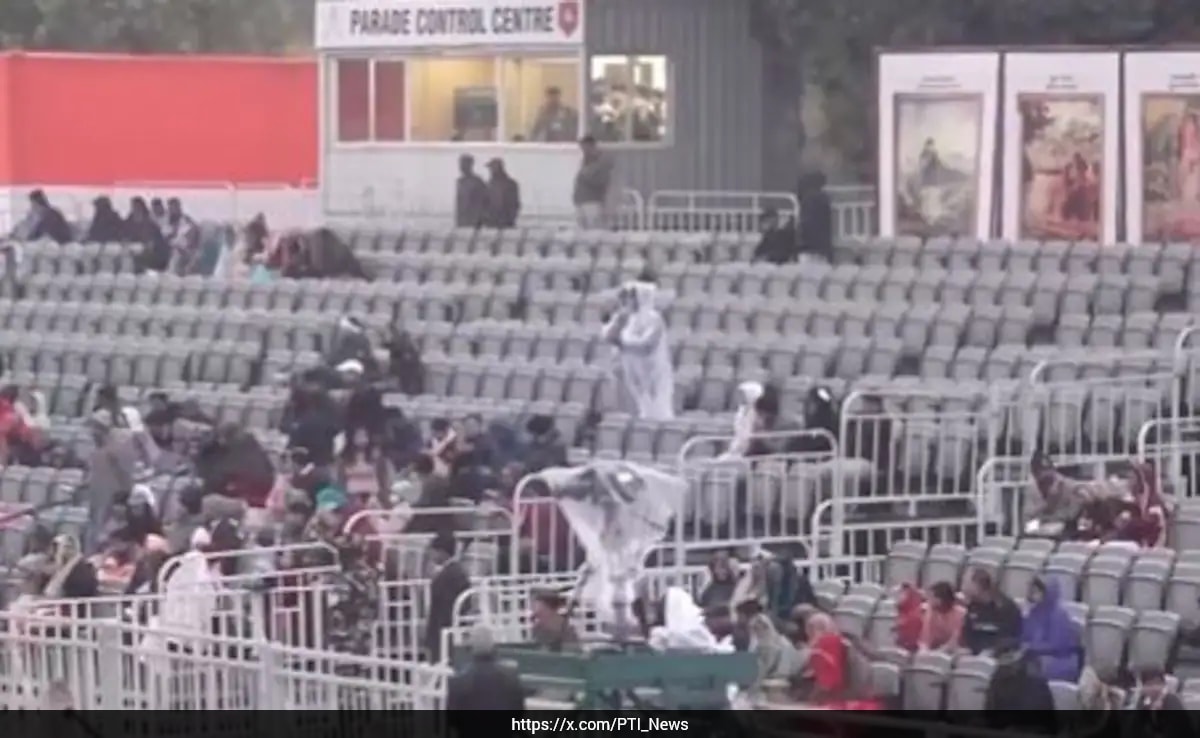 Heavy showers and thunderstorms swept across Delhi-NCR, but the stands at Kartavya Path remained occupied as spectators gathered to witness the final practice run of the Republic Day parade. A video from the venue, now widely shared on social media, showed people seated together under shawls and raincoats, patiently waiting for the rehearsal to begin.