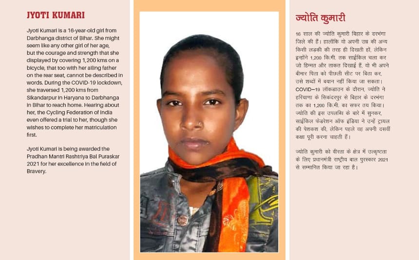 "Cycle girl" Jyoti Kumari, who had pedalled all the way from Gurugram to Bihar with her father seated on the carrier during the nationwide lockdown, found herself in the limelight again on Monday when she interacted with Prime Minister Narendra Modi as a recipient of the "Pradhanmantri Bal Puraskar".