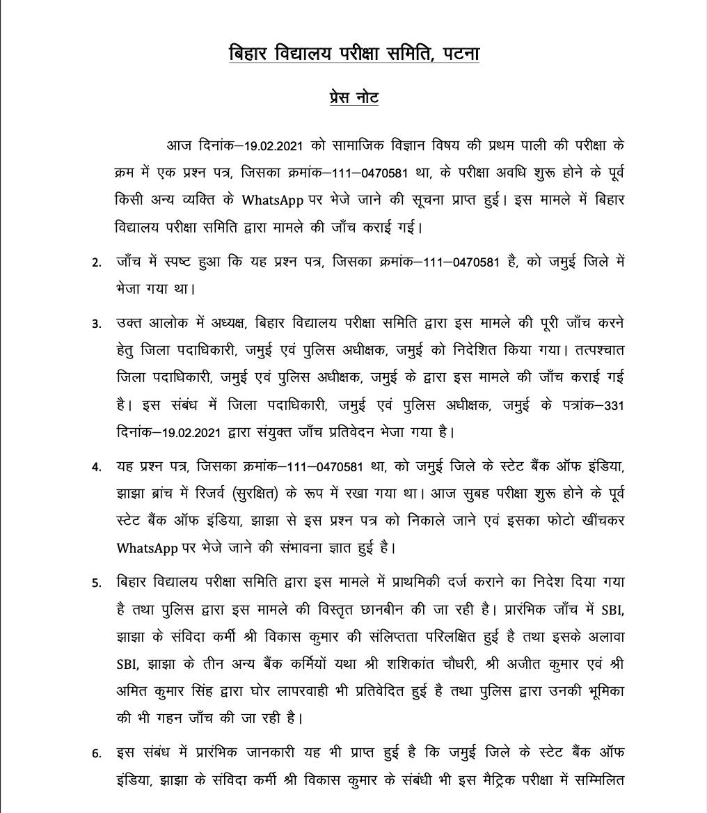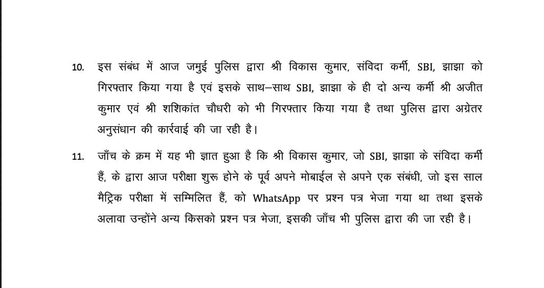 The BSEB said in a statement issued late on Friday evening that it was found in the investigation that the question paper was leaked through WhatsApp by a contractual staff of the Jhajha branch of the State Bank of India (SBI). An FIR regarding the paper leak has been lodged. The police have arrested a contractual employee named Vikas Kumar who allegedly opened the reserved question paper and sent its photo on WhatsApp. Police have also arrested two employees of the SBI Bank - Shashikant Chaudhary and Ajit Kumar in the paper leak incident.