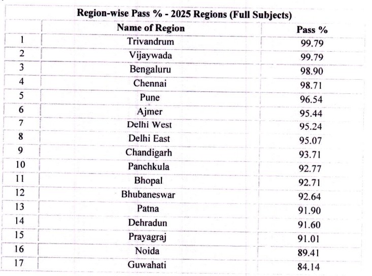 At the other end of the spectrum, Guwahati has recorded the lowest pass percentage among all regions at 85.32%.