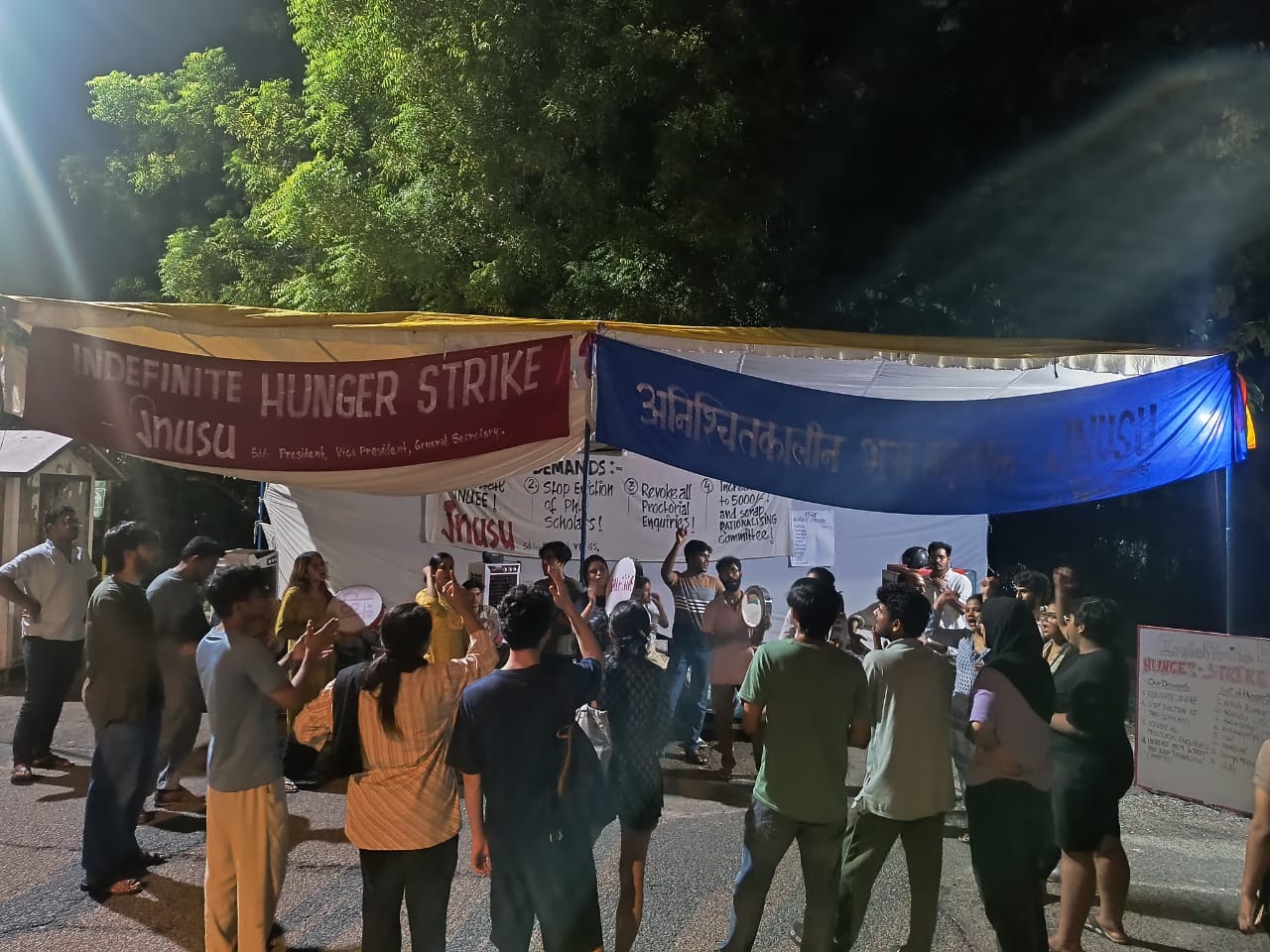 As the hunger strike at Sabarmati T-point continues, JNUSU president Nitish Kumar, Vice President Manisha, and General Secretary Munteha Fatima maintain that their protest would go on until the administration agrees to reinstate the JNUEE and engage in a wider, transparent dialogue on admissions policy.