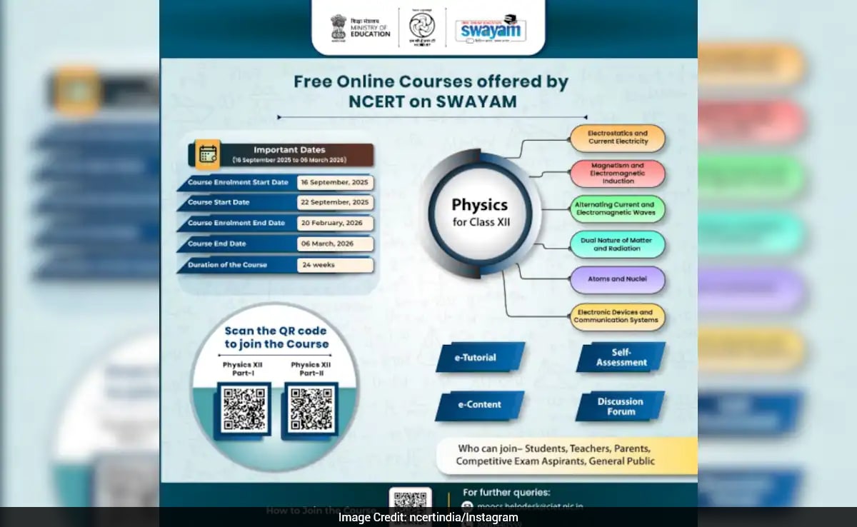 The National Council of Educational Research and Training (NCERT), under the Ministry of Education, has announced a free online Physics course for Class 12 students on the SWAYAM platform. The initiative seeks to enhance students' understanding of Physics while providing educational resources throughout India.