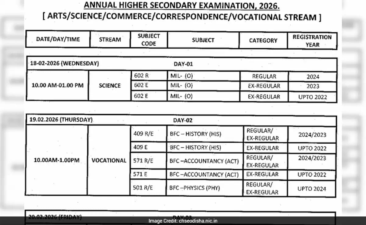 Odisha CHSE Class 12 Exams: The Council of Higher Secondary Education (CHSE), Odisha has released the date sheet/time table for the 2026 Annual Higher Secondary Examination (Class 12). The exams will begin on February 18, 2026, and continue until March 21, 2026. Theory papers will be held from 10 am to 1 pm, while vocational exams will take place from 10 am to 12 pm or at different timings for certain subjects.