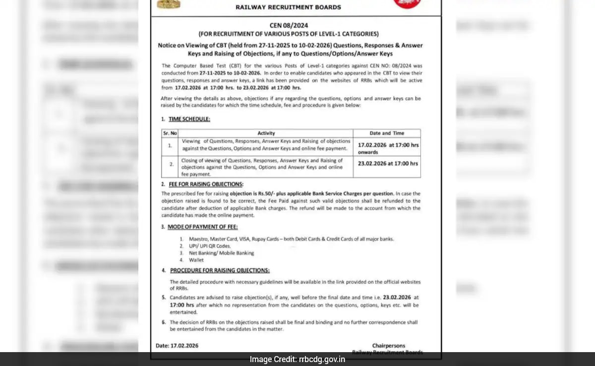 RRB Group D Answer Key 2025: The Railway Recruitment Board (RRB) has released the answer key for various recruitment examinations including Group D which were conducted between November 27 and February 10, 2025. The Group D examination was held on January 7 and 8, and again from February 2 to February 9, 2026. Candidates who appeared for the exams on the above-mentioned dates can check and download the answer key through the link available on the respective region-wise official RRB websites, as stated in the official notice. The answer key will remain available for download till February 23, 2026. Until this period, candidates can also rasie objections.