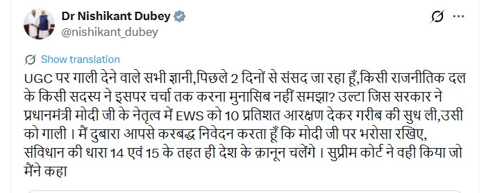 UGC New Rule Row Live: Nishikant Dubey Urges Trust In Constitution, Modi Government