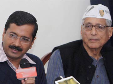 AAP leader Arvind Kejriwal addresses a press conference in New Delhi. Mahatma Gandhi's grandson Rajmohan Gandhi also present.