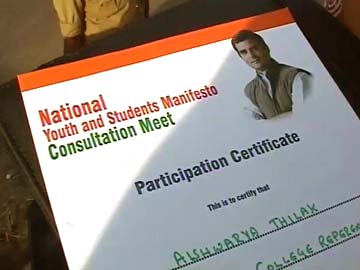 Mr Gandhi met 250 students from all over the country to seek direct feedback from people for his party's manifesto for the national elections, due by May. Aishwarya Thilak, a student of Political Science from Bangalore's Mount Carmel College, was among the students to receive the certificate of participation at the event.