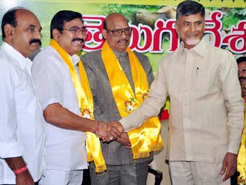 Congress leaders TG Venkatesh, E Prathap Reddy, are welcomed by Chandrababu Naidu in TDP at his residence in Hyderabad on March 9