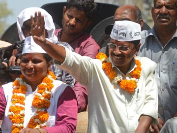 Aam Admi Party (AAP) leader Arvind Kejriwal (C) campaigns with AAP candidate for Northwest Delhi constituency Rakhi Birla (L) during a road show in New Delhi on April 8, 2014.