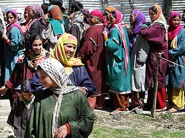 Women voters wait for their turn to cast votes for Lok Sabha polls at a polling station in Noorabad area of Anantnag