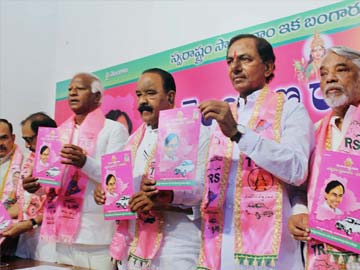 TRS President K Chandrasekhara Rao with party leaders releasing candidates' list along with party manifesto in Hyderabad on Friday