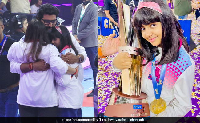 Aishwarya Rai and Abhishek Bachchan are the happiest after their team, Jaipur Pink Panthers, won the trophy at Pro-Kabaddi League on Saturday. The couple shared many pictures on their respective Instagram handles in which they are posing with their team. At the event, their daughter Aaradhya Bachchan and niece Navya Naveli Nanda were spotted cheering for the team. After the team was declared the winner, Abhishek can be seen hugging Aishwarya and Aaradhya. On Instagram, Aishwarya has shared pictures - in the first, Aaradhya can be seen posing for the camera with a trophy. In the next, the family of three happily poses for the camera. In the last image, Aishwarya and Aaradhya flash their million-dollar smiles in a selfie. Sharing the post, the actress wrote, "Jaipur Pink Panthers are the Pro Kabaddi Season 9 CHAMPIONS. What a fabulous season! We are so proud of our team of incredibly talented, focused and hardworking kabaddi sportsmen... Kudos boys!!! God Bless always Love, Light, more power to you and Shine on!"