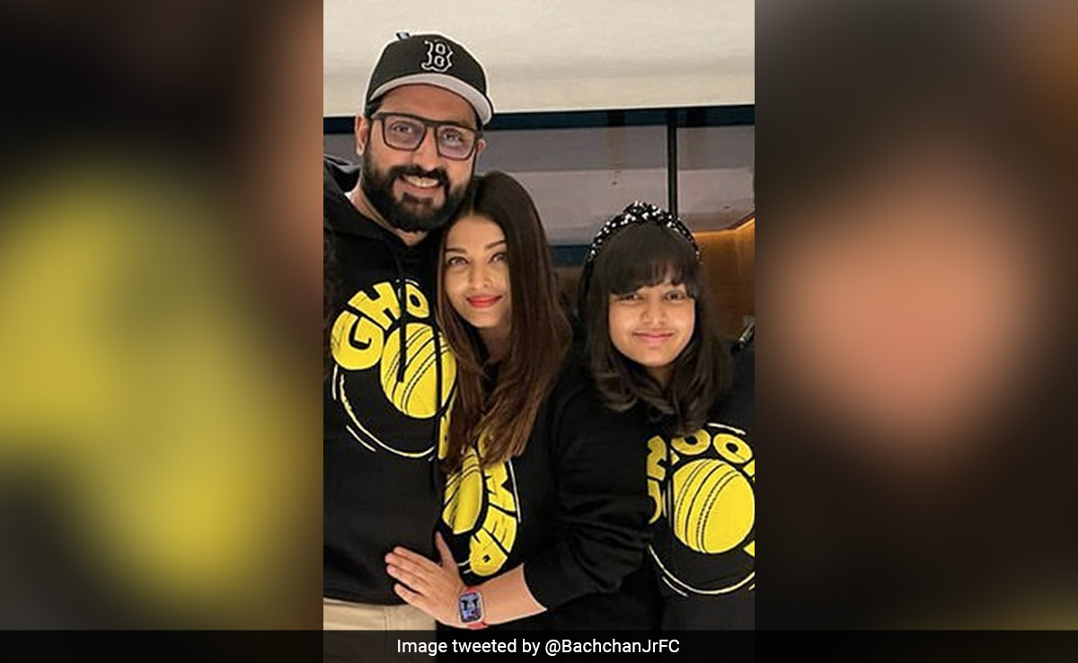In the picture shared by a fan page, we can see the mother-daughter duo twinning in black sweatshirts, which have the name of the film Ghoomer written in yellow on them. Abhishek Bachchan can also be seen wearing the same sweatshirt.