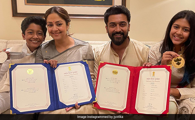 It's time for double celebrations at Suriya and Jyotika's house. At the 68th National Film Awards, both Suriya and wife Jyotika's co-produced 2020 project Soorarai Pottru won Best Film Feature Film. Besides that, Suriya also won the Best Actor award for Soorarai Pottru. The actor shared the Best Actor award with Ajay Devgn, who won for Tanhaji. Jyotika shared pictures from the ceremony on her Instagram profile. The star couple celebrated their big win with their daughter Diya and son Dev. "Proud and blessed," Jyotika captioned the post.