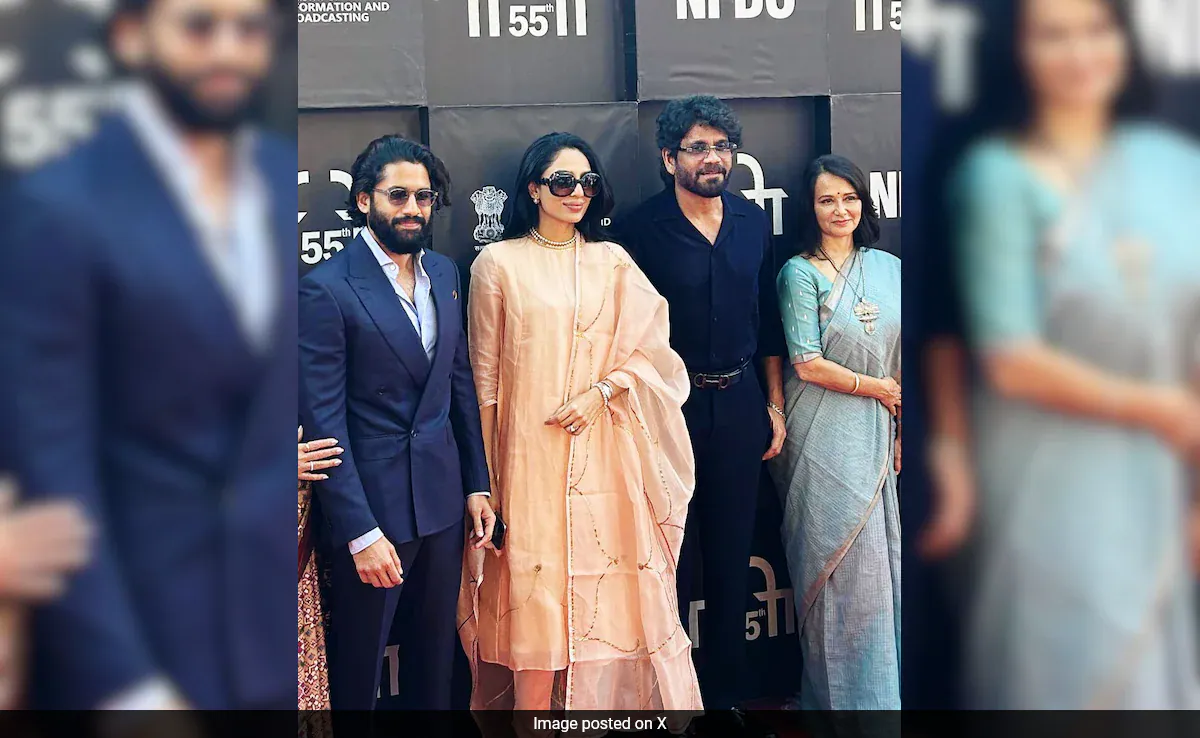 Weeks before their wedding, Naga Chaitanya and Sobhita Dhulipala made a stunning appearance together at the International Film Festival of India (IFFI) 2024 in Goa, which kickstarted on November 20. Naga Chaitanya's parents Nagarjuna and Amala Akkineni joined the couple. Sobhita Dhulipala joined the Akkinenis for a perfect family photo-op. In the pictures, Sobhita wore a cream-coloured salwar suit and added a dash of style with a pair of black shades. She kept her makeup minimal and tresses loose. Naga Chaitanya complemented her in a blue suit. In the family picture, Amala Akkineni wore a pretty saree and Nagarjuna wore a blue shirt. They were all smiles for the camera. The pictures went viral in no time. Take a look: