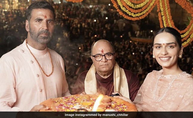 Akshay Kumar and Manushi Chhillar are busy promoting their upcoming film Samrat Prithviraj. The duo, who are in Varanasi, performed evening aarti on Monday. In the photos shared on their respective Instagram handles, Akshay looks charming in an off-white kurta while Manushi looks pretty in a peach coloured salwar suit. She kept her makeup natural and tied her hair into a neat bun. Both Akshay and Manushi captioned the images as "Har Har Mahadev". Check out the posts below: