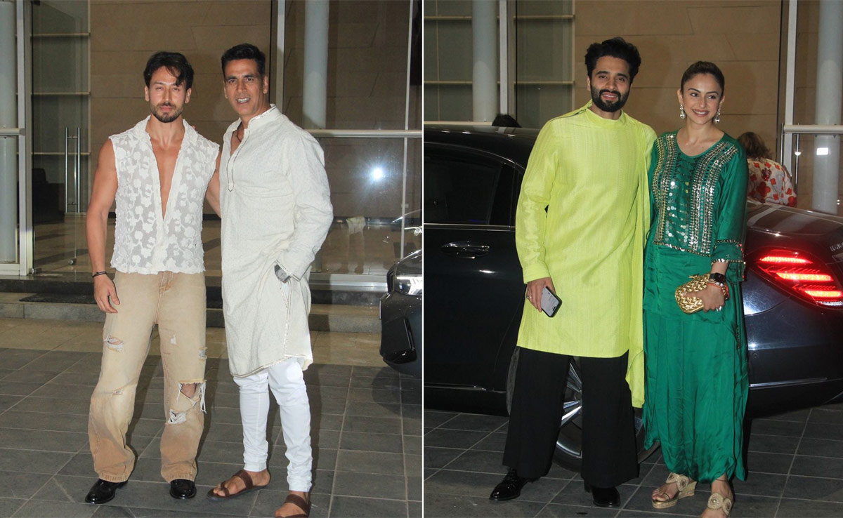 Bade Miyan Akshay Kumar and Chote Miyan Tiger Shroff had an eventful Sunday as they were spotted attending director Ali Abbas Zafar's Iftaar party in Mumbai. The duo, whose action thriller Bade Miyan Chote Miyan is all set to hit the theatres on April 11, ditched their action hero getups and opted for ethnic ensembles for the evening. The two were seen twinning in shades of white as they posed in style for the shutterbugs outside the party venue. Besides Akshay and Tiger, their female leads in the film - Manushi Chhillar and Alaya F were also seen attending the party in their traditional best. Manushi was pictured in a pastel suit while Alaya F looked drop dead gorgeous in a red outfit