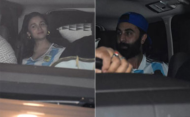 Alia Bhatt and Ranbir Kapoor took a break from mommy-daddy duties and stepped out to enjoy the FIFA World Cup 2022 with friends. The couple was spotted at filmmaker Luv Ranjan's house on Sunday, twinning in the Argentina jerseys. Alia looked pretty as she paired the jersey with blue jeans and left her hair loose, while Ranbir paired it with black jeans and added a blue cap to accentuate his look. It seems, they watched the final between Argentina and France with Arjun Kapoor and Rajkummar Rao as they were also pictured at the filmmaker's house. Arjun waved at the shutterbugs while Rajkummar happily posed for them in a black T-shirt and blue jeans.
