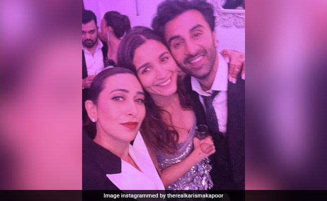 Karisma Kapoor has shared a post giving her fans a glimpse of Ranbir Kapoor and Alia Bhatt's post-wedding bash. Alia and Ranbir hosted a party for their family and close friends at their Vastu house on Saturday. Karisma shared a picture with newlyweds and captioned the image as, "Big Love for Mr and Mrs Ranbir Kapoor". In the image, the trio can be seen flashing their million-dollar smile. Alia can be seen wearing a grey sequin dress, while Ranbir is looking dapper in a black pantsuit. Karisma, as usual, looks pretty in a white-black dress.